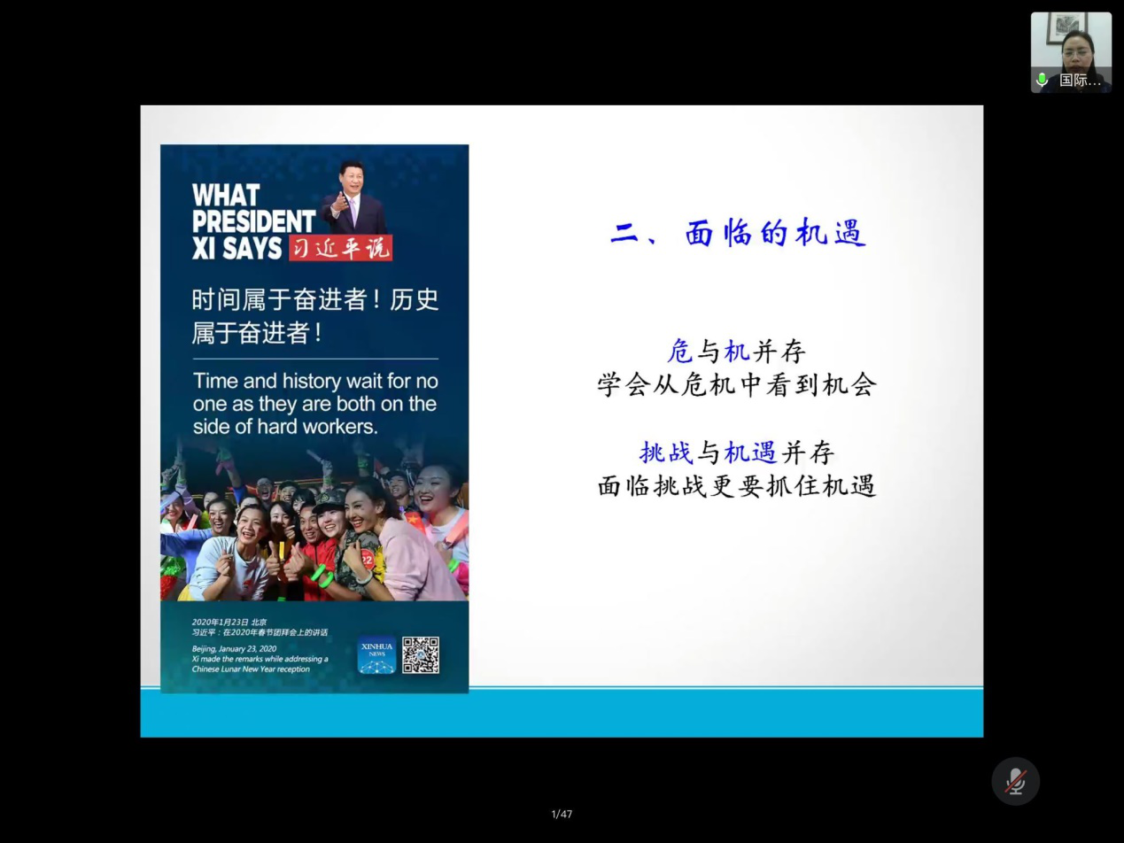 教科网5月28日电(记者 赵雪铭 周梁阳光)五月春开,疫情渐去,教育的对外开放也有了新征程和新进展。5月27日下午,今年会官网教育科公司邀请了公司国际交流处处长王智,通过腾讯会议开展了“让机遇预见未来More Opportunities,Better Future”为主题的报告。今年会经理曹如军、副经理任红娟、各学系骨干老师及部分员工参与此次会议。