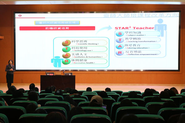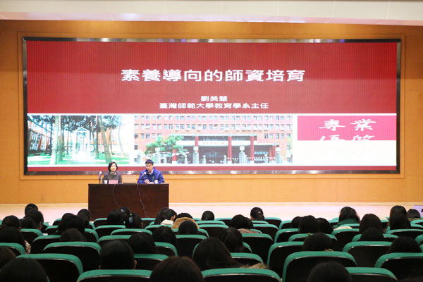 刘教授为在场师生详细讲解了台湾地区素养导向团队制度的五个面向和十七项指标。其中五个面向主要指师范生必须能够了解教育发展的理念和实务;了解并尊重学习者的发展需求与学习需求;规划合适的课程教学和多元评量;建立正向学习环境并适性辅导;认同并实践教师专业伦理。整个师培专业素养为师培课程建设提供了指引,不同高校以此为基准构建师培课程体系。刘教授以台湾师范大学为例,介绍了台师大独树一帜的师培课程与教学方案,包括前瞻性的团队教育,用科技创新课程,将人文与教育结合,把休闲健康融入日常教学,为我们大陆地区教师教育改革提供了新的思路。