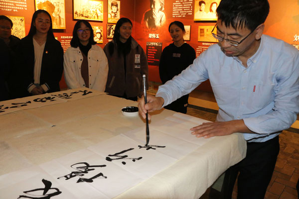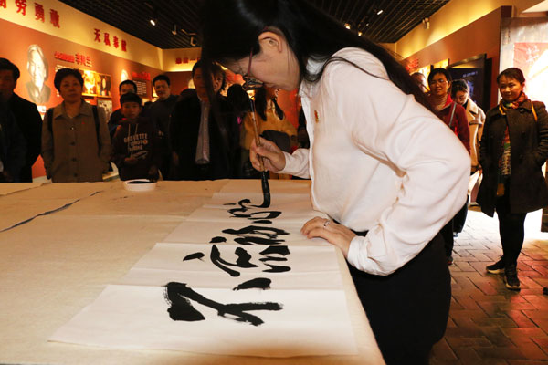 图为何杰用毛笔书写“弘扬沂蒙红嫂精神”。记者 干爽 摄