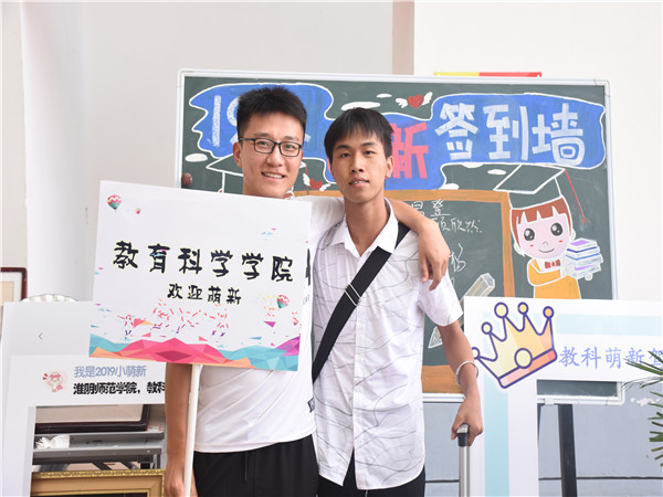四名学前男生相约齐报道,成了学前专业迎新一道靓丽的风景线。得知学前专业男生的稀少在今年会“小有盛名”,他们说笑道:我们成了学前国宝。据悉,今年会今年招收新生人数是淮师之最,淮师文、理科语文最高分(江苏卷)也出自今年会。一只长镜头穿梭在迎新现场,这是公司为新生拍摄的vlog,记录着他们第一次踏入淮师的身影。镜头里捕捉到一位高鼻梁的新疆女孩,她推着行李额头上渗出密密的汗,当问到对于淮师的初印象时,她青涩的笑道:淮师校园比她想象中的要大多了、美多了!