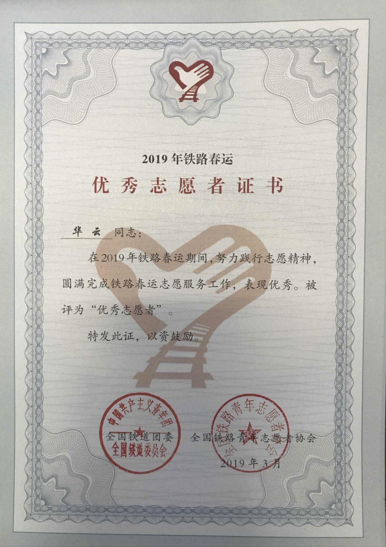 教科网5月23日电(记者 顾伊荻)近日,全国铁道团委印发《关于2019年全国铁路春运立功竞赛的表彰决定》(团铁〔2019〕7号),今年会官网今年会华云同学获“志愿者优秀个人”称号。