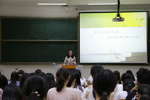她以淮师一附小9909和9805届的员工为例,以五个小话题、分享趣味性小故事的方式向同学们阐述了具体工作时的应对方法。在遇到难以管束的班级时,她就会及时与家长进行沟通交流,将班级分成不同小组,采用评优方式带他们进行系列化的职业体验;在遇到调皮的员工时,她选择用表扬、鼓励的方式化解员工的抵触心理,装饰员工的小错误,让错误变得可爱起来。一个个生动的故事给同学们带来欢笑的同时也引来了他们的沉思,同学们收获良多。