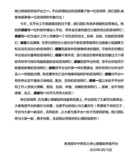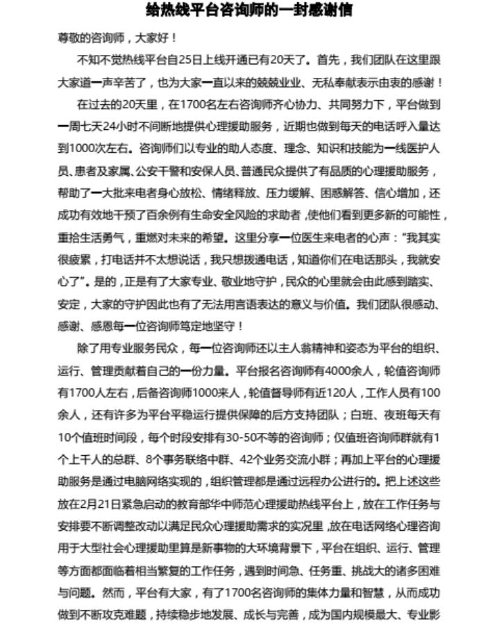 图为给热线平台咨询师的一封感谢信。