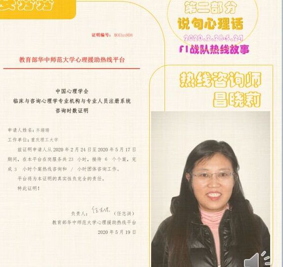 采访最后,昌老师谈了自己的感想:疲尽春归会有时,静待花开赤子心。2020的寒冬,让所有人的心连到了一起。感谢教育部华中师范大学心理援助热线平台,让我们有机会在这次战“疫”里充分发挥自己的心理学知识、技能与经验,为救助他人贡献自己的力量。我们共同坚守,不论日夜,无惧风雨;不忘初心,守望相助。这些勇毅前进的脚步,相伴同行的感动,必将交织成华夏大地最动人的乐章。向所有在热线上默默付出的人致敬!