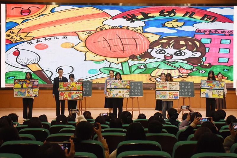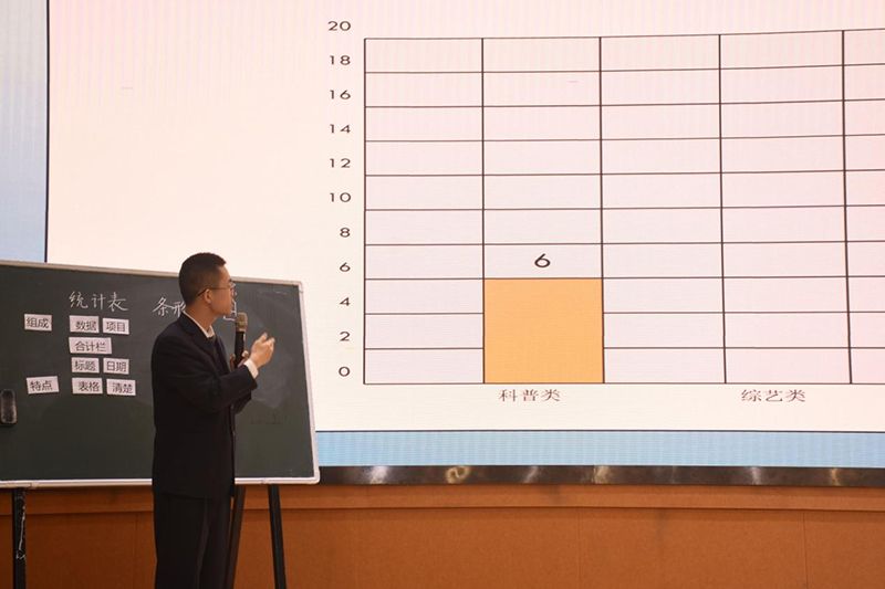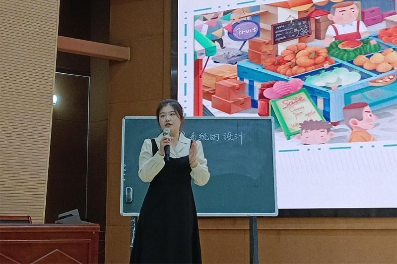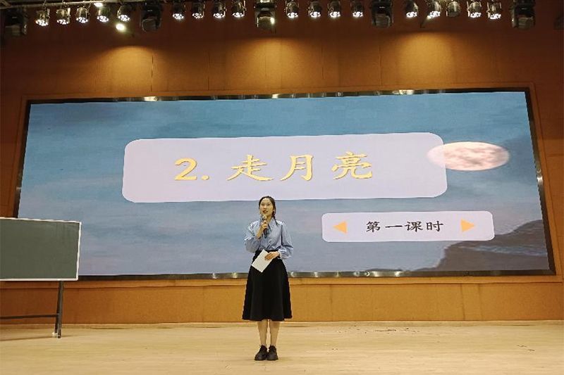 首先,由学前教育专业的选手带来舞蹈展示,在空灵轻快的音乐和童声合唱的烘托下,尽显温柔与暖意,彰显出天真与童趣。接下来是现场书写粉笔字,在学前教育专业同学美妙的即兴弹唱即将结束之时,粉笔字的书写也恰好进入尾声,在精准时间的把控下,优秀的作品便在我们眼前呈现。在现场书写的钢笔字、粉笔字作品展示后,一幅幅学前教育专业同学的主题墙设计作品在台上陈列。随后,各个专业的同学展现了丰富多彩的口语表达和模拟教学内容。小学教育(文)的选手展示了口语表达和《走月亮》的模拟教学,小学教育(理)的选手呈现了《统计表和条形统计图》的模拟教学,教育技术的选手展示了《信息系统的设计》的模拟教学,学前教育专业的选手表演故事《会说话的卷心菜》《会爆炸的葡萄》,模拟教学——小蛋壳等等,将同学们扎实专业的基本功展现的淋漓尽致。