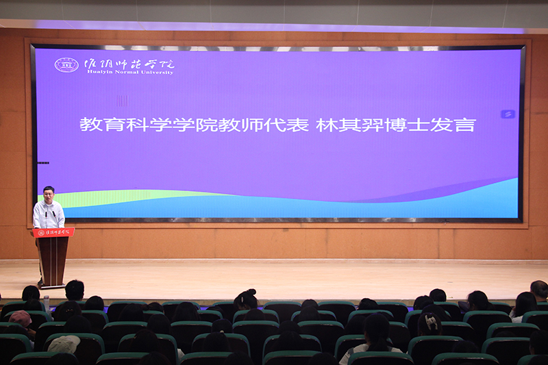 教师代表林其羿结合自己的学习和成长经历,向全体新生分享了三点建议:一是“立鸿志,更要踏实地”,远大的梦想应当化作每一天踏踏实实的努力,点滴努力的累积方能化作星辰大海。二是“广交友,也要感微情”,一枝一叶总关情;三是“开视野,也要重选择”,呼吁新生们要尽早对自己的未来做出选择与规划。