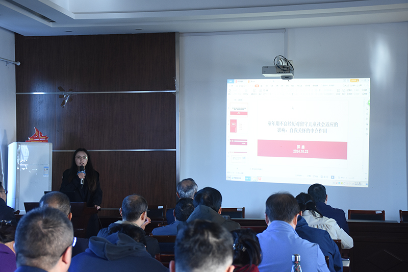 活动伊始,郭鑫就对童年期不良经历对留守儿童社会适应的影响展开分享。她基于国家社会对留守儿童持续重点关注的现状,结合以往研究及文献资料,运用定向追踪的研究方法和众多测量工具,深入浅出地分析了儿童自我关怀的重要中介作用。