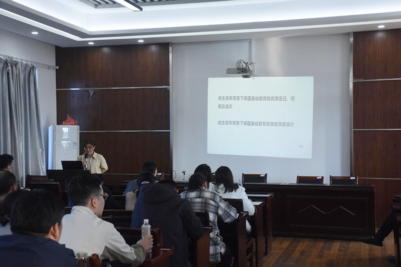 随后,刘青以“低生育率背景下韩国基础教育政策的顶层设计”为题进行了深入的分析和论述。她以四次基本计划为切入点,深入分析了韩国生育政策各阶段的内容和特点、韩国低生育现状和老龄化社会基本计划以及韩国国家层面计划蓝图。接着,张青分享了从中得到的启发,获得现场老师们的认可与赞同。