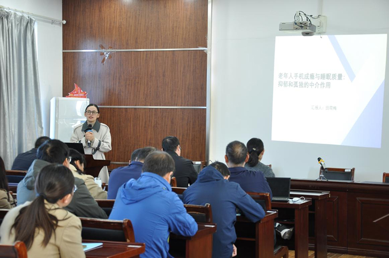 活动伊始,田荷梅分享了她对老年人手机成瘾与睡眠质量关系的研究。她汲取并总结了以往相关研究的经验成果,将研究对象创新性地聚焦于老年人群体,并通过更为深入的调查,对抑郁和孤独在其中所起的重要中介作用进行了剖析。