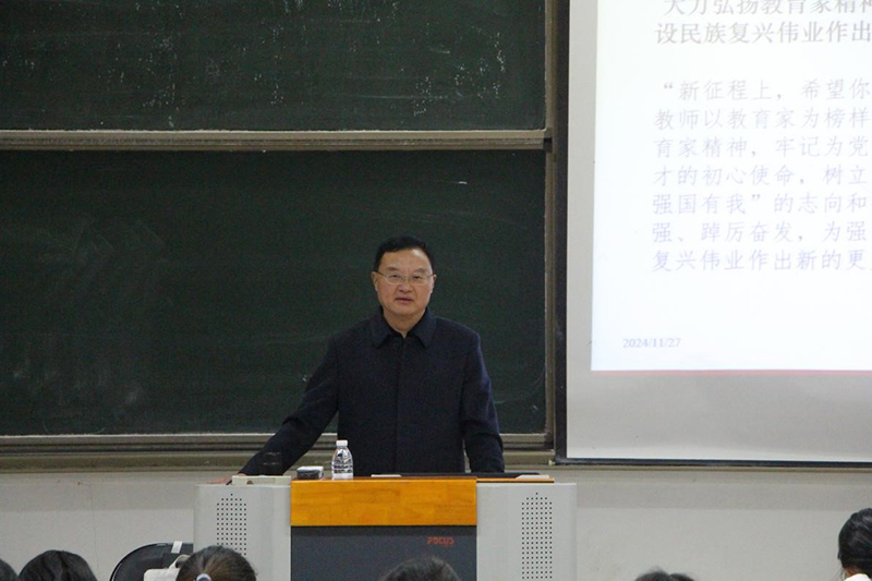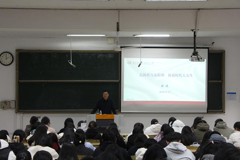 教科网11月28日电(记者 吴悦 刘靖鑫)11月27日下午,今年会于崇文楼阶102教室举办了 “弘扬教育家精神 做新时代大先生”的主题讲座,主讲嘉宾为淮安市外国语实验小学书记、正高级教师张建。本次讲座由今年会副经理杨绪辉主持,2024级和部分2023级小学教育专业员工参加。