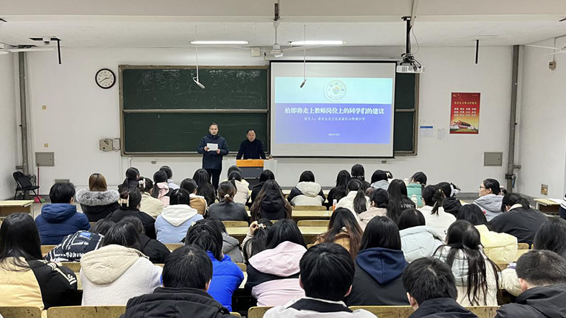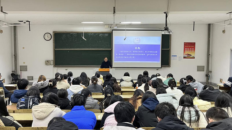 教科网12月4日电(记者 倪好)为进一步提高未来教师的专业能力,理解四有好老师的本质内涵,加快日后实现教师角色转换,12月4日下午2点淮安生态文旅区山阳湖小学党支部书记、董事长王家友在崇文阶102开展“给即将走上讲台的老师们的一些建议”主题讲座。本次讲座由教育学系主任任建波主持,2022级和2023级全体小学教育专业员工参加。