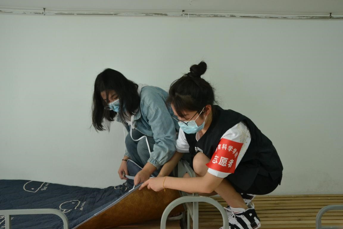 图为志愿者帮助新生整理床铺。记者 叶佳瑶 摄