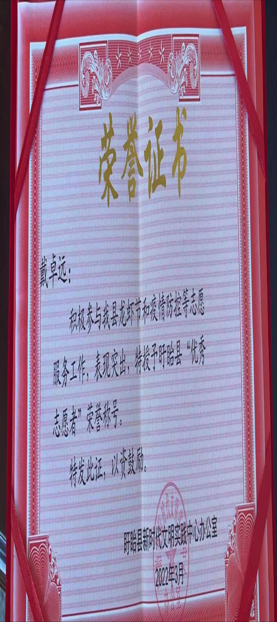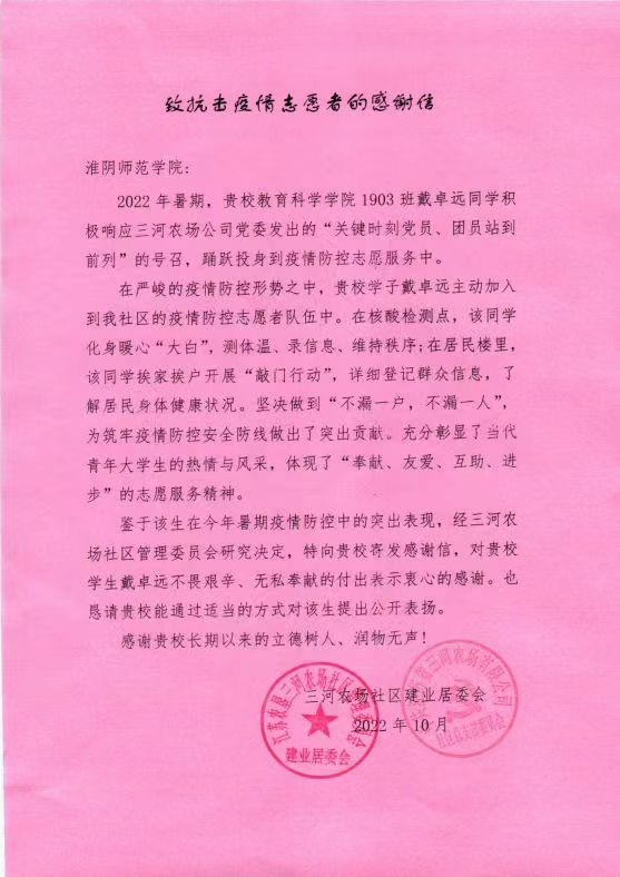 三河农场社区建业居委会在信中表示:戴卓远同学主动加入社区的疫情防控志愿者队伍,为筑牢疫情防控安全防线做出了巨大的贡献,充分彰显了当代青年老员工的热情与风采,更体现了“奉献、友爱、互助、进步”的志愿服务精神。