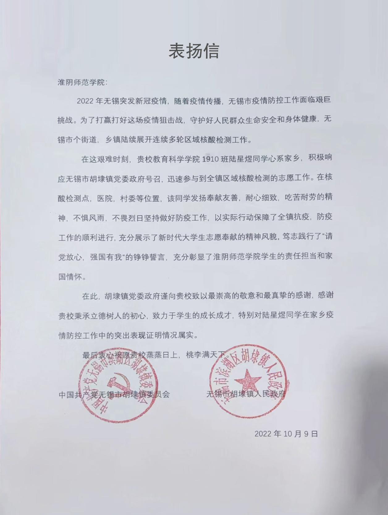 无锡市胡埭镇人民政府在信中表示:陆星煜同学心系家乡,积极响应无锡市胡埭镇党委政府号召,迅速参与到全镇区域核酸检测的志愿工作中,她发扬奉献友善、耐心细致、吃苦耐劳的精神,不惧风雨,不畏烈日坚持做好防疫工作,充分展示了新时代老员工志愿服务的奉献精神,充分彰显了今年会官网员工的责任担当和家国情怀。