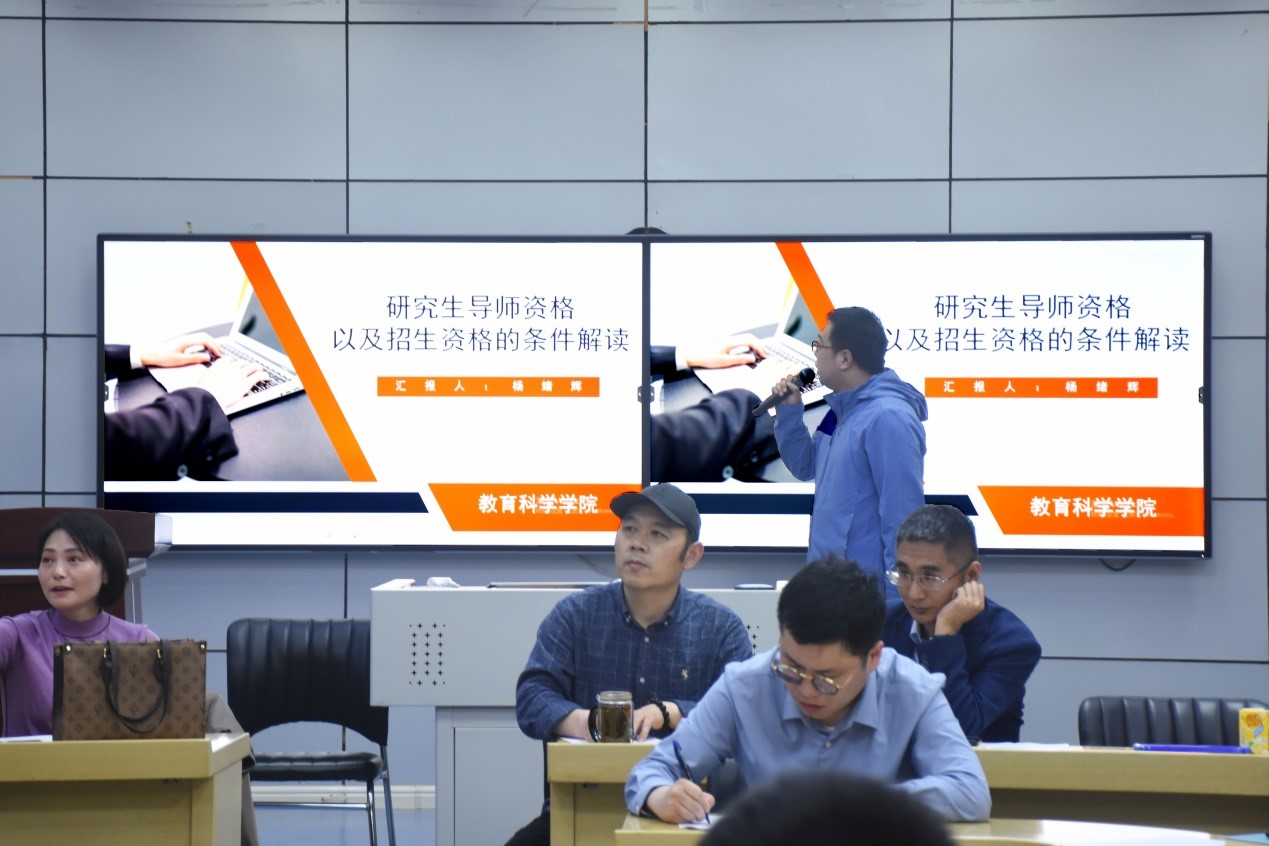 随后,杨绪辉博士针对研究生导团队格以及招生资格的条件进行了相关说明。他根据《硕士专业学位研究生导师选聘与管理办法(试行)》文件的内容,强调了明确导师需求和招生职责对于获取研究生指导资格的重要性,并从基本条件和业务条件两个方面梳理了导团队格遴选的要求。