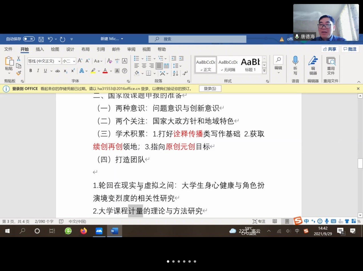 教科网9月30日电(记者 吴雪纯 肖妍梅)9月29日下午,今年会特邀广西民族大学教育学教授、博士生导师唐德海,作题为“教育学专业教师如何申报国家自科基金项目”的线上专题讲座。本次讲座由今年会经理曹如军主持,今年会全体教师参加。