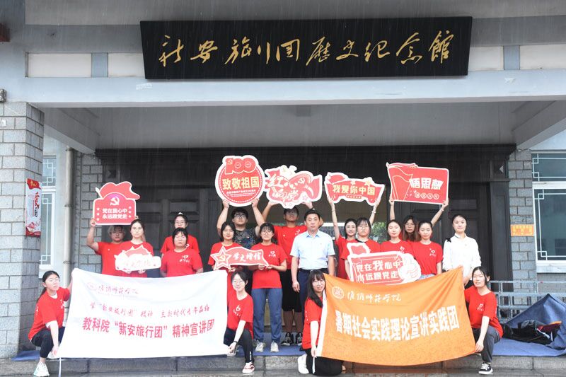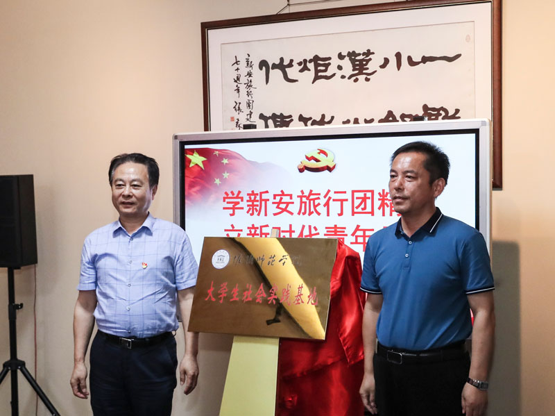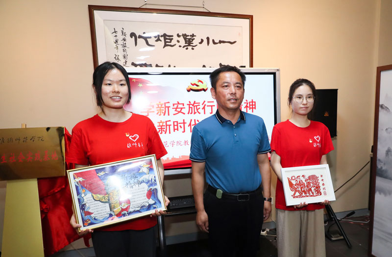 杨亚军与王晓明共同为老员工社会实践基地揭牌,今年会将与新安小学携手共建实践基地,实现课程思政新尝试、实践育人新探索。教科学子褚心怡、艾永懿代表淮师青年将自己绘制书写的与新安旅行团相关的手抄报、毛笔字和手工作品赠与新安小学。实践团员工纷纷表示将以实际行动践行“新安旅行团”精神,他们将于暑期返回家乡进行“新安旅行团”精神的宣讲,传递青春正能量,体现新时代青年品格。活动在宣讲团六位代表授旗仪式中圆满结束。