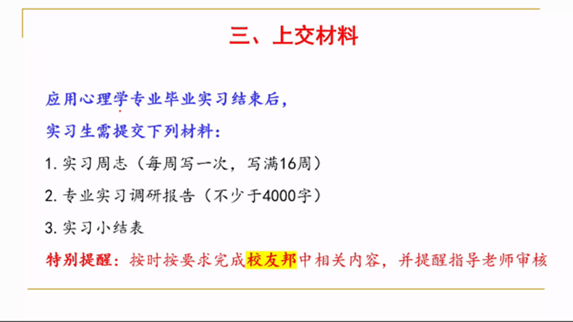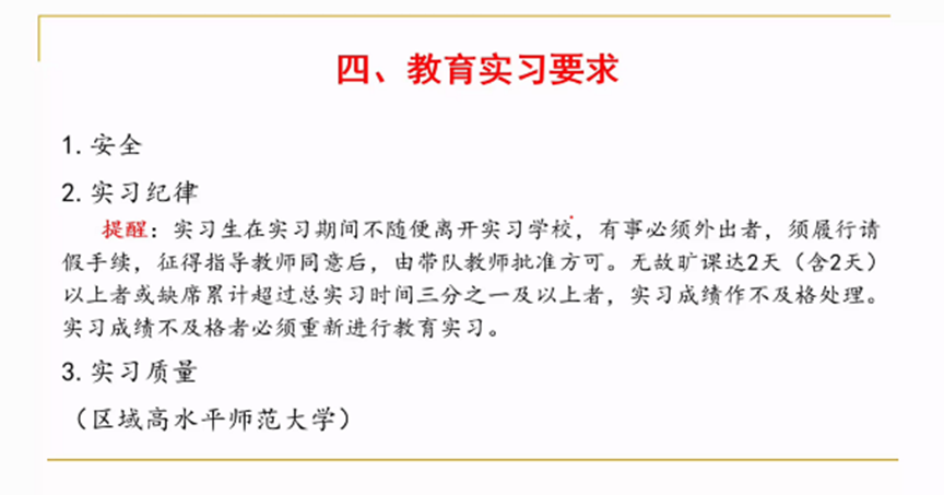 此外,任红娟为同学们实习资料的填写及上交做出了特别的提醒。然后从三方面强调了本次教育实习的要求,督促同学们在实习过程中,同样要注重安全,遵守实习纪律,提高实习质量。