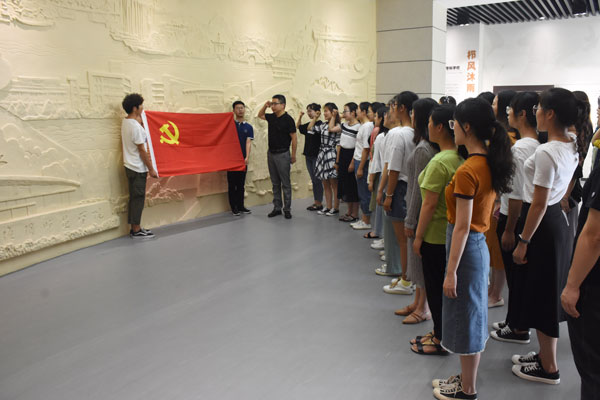 在周恩来精神教育基地,戴云带领党员们进行宣誓,鲜红的党旗,简而有力地渲染出庄严的气氛。现场响起激昂的宣誓声,每个同学都用发自内心的声音抒发对党忠诚的决心,短短几十字的誓词是他们入党后对党的承诺。戴云表示,希望毕业生们将入党誓词内容真正践行到日常生活中,从中提取正能量,以优秀学长学姐为榜样。15级员工代表陈华、16级员工代表余星怡进行发言,他们讲述参观校史馆的感受,表明发扬淮师人精神的决心。