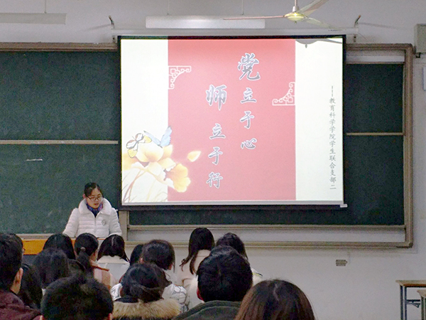15级预备党员刘慧、徐丹丹、董小杰和陈露,分别通过播放幻灯片分享了各自的见习感悟。其中,徐丹丹介绍淮安市实验小学的教育理念“让每一位员工都拥有成长的快乐,让每一位教师都享受职业的幸福”,开阔了同学的视野,使他们对小学教育有更深刻的认识。刘慧结合亲身经历勉励在座的17级员工,见习要调整好心态,做好吃苦的准备。在校期间要多学多做,扎实基本功,同学们反响热烈,受益匪浅。17级新生表示,这对他们树立理想信念,前瞻职业规划具有很大的促进作用。