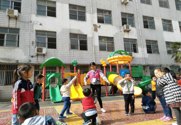 图为陆佳静同志和孩子们玩小手拉小手游戏 沙荣晨 摄