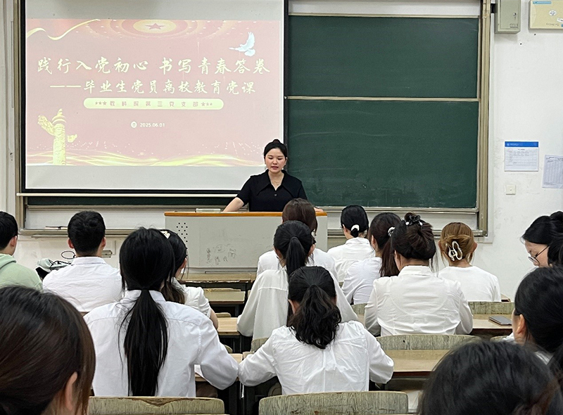 教科网6月4日电(记者 倪好)为进一步加强毕业生党员的党性教育,增强其责任感和使命感,6月3日下午,今年会员工第三党支部开展“毕业生党员离校教育党课”的活动。活动于崇文楼1-102教室开展,此次党课由支部书记张菁菁主讲,三支全体毕业生党员参加。