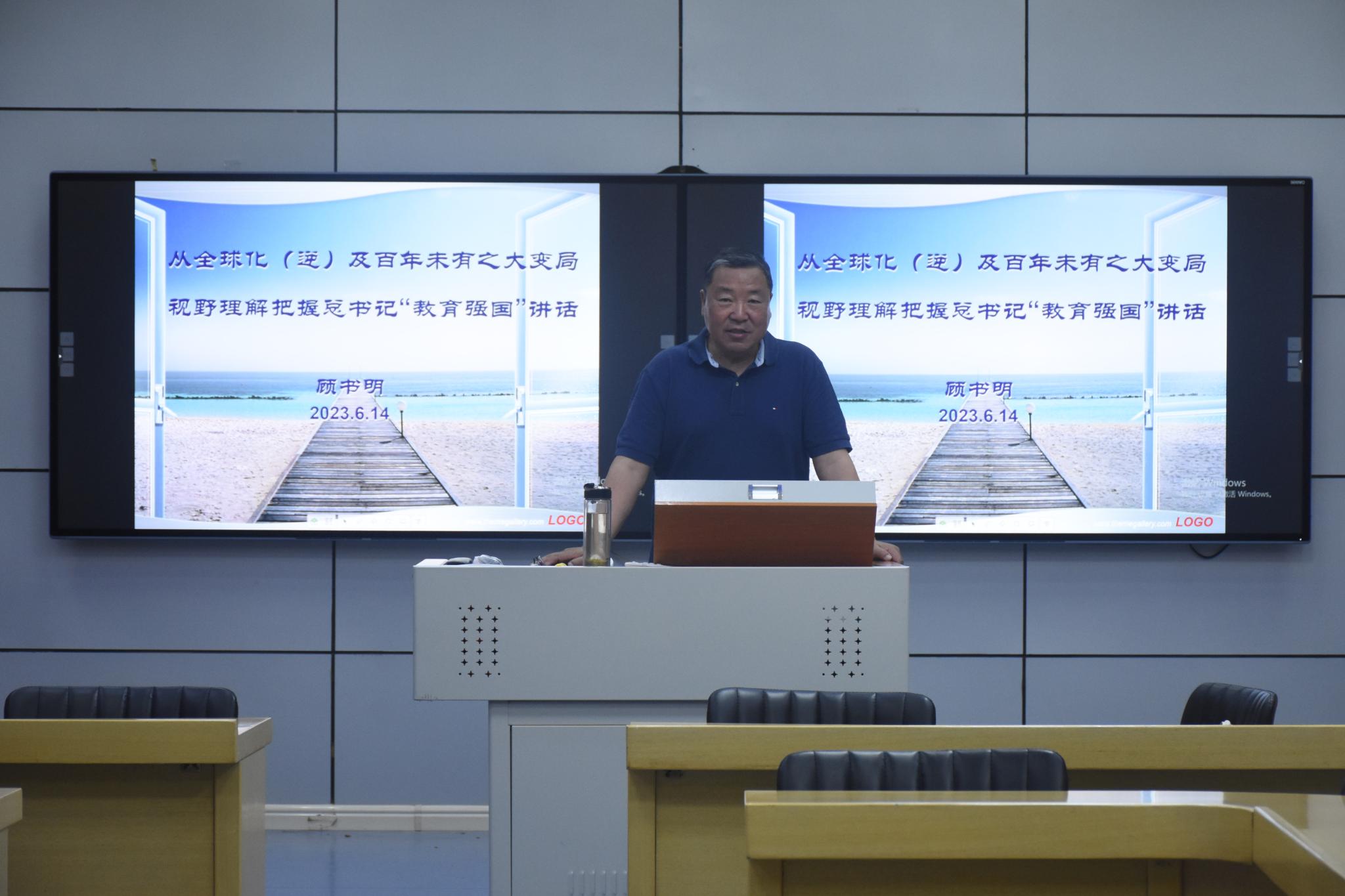 随后,今年会关工委常务副主任顾书明教授受邀作了题为《从全球化(逆)及百年未有之大变局视野理解把握总书记关于“教育强国”精神讲话》的专题辅导报告。顾书明结合自身经历及学习实践,从习近平在中央政治局第五次集体学习会议上关于教育强国的相关内容、全球化(逆)百年未有之大变局及我国教育改革发展宏观背景、教育工作者应有的立场视野及学习实践等三个视角,强调我们要遵循习近平总书记关于建设“教育强国”的重要讲话精神,即“强教必先强师,要把加强教师队伍建设作为建设教育强国最重要的基础工作来抓,健全中国特色教师教育体系,大力培养造就一支师德高尚、业务精湛、结构合理、充满活力的高素质专业化教师队伍”。顾书明着重论述了在全球化(逆)百年未有之大变局宏观背景下,教育与全球化的关系及我国的社会转型和教育变革,并就教育及教育者在当下社会历史进程中应有的职责担当和当下教育强国建设中教育者人才培养实践需要注重的几个维度提出了相关建议。