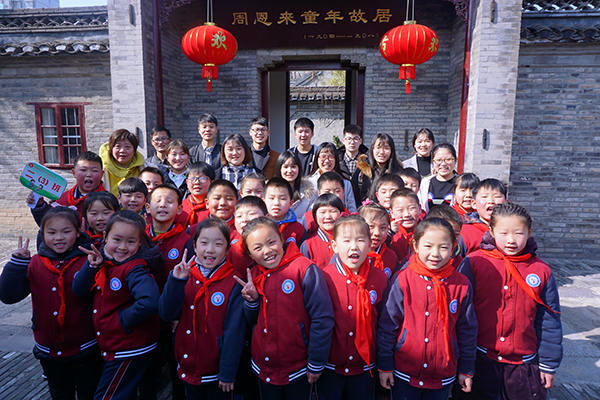 恩来童年读书处青墙黛瓦,庄重肃穆,草木欣荣,春色萌动。内部有周恩来童年故居、恩来资料展区、石板街等恩来遗物展区,部分展区中设有恩来的人形雕塑,周颖颉依次为各位同学讲解。通过对雕塑、照片、文字、遗物等相关材料的观察,同学们对恩来的精神风貌有了更深一层的认识。游览途中,大家偶遇在淮师一附小见习时认识的孩子们,于是充当起导游,结合自己对恩来精神、恩来生平经历、经典故事等方面的了解,为孩子们进行了生动而丰富的介绍。孩子们求知若渴,纷纷追随同学们的脚步,游览遍景区并合影留念。在孩子们与众多游客的见证之下,同学们来到景区门口的恩来浮雕之前,齐声宣读了由小教专业卓越教师班起草的“纪念恩来诞辰120周年‘来读书’倡议书”,号召更多的人在这个日子里,继承恩来总理遗志,“为中华之崛起而读书”。