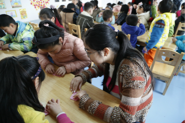 图为1511的同学们教孩子们折纸 记者 夏彤 摄