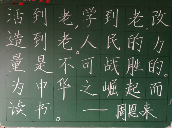 活动开始时,1409班的同学们纷纷拎来自己事先写好的小黑板来。周总理的诗词和很多歌颂周总理的诗词在同学们的小黑板上得以呈现。黑板上,同学们的字工工整整。活动中,1409班的孙同学表示:“我们虽然不能和总理活在一个时代,但是可以从粉笔字的一笔一划中去感受总理的风采。”同学们用手中的粉笔一笔一划的书写着周总理的爱国精神。一横一竖都是在践行总理的“活到老,学到老,改造到老”的思想。我们看到,眭同学黑板上写到“大江歌罢掉头东,邃密群科济世穷。面壁十年图破壁,难酬蹈海亦英雄。”她解释到:“之所以选择写这首诗,是因为这是我比较喜欢的一首,这是总理十九岁时东渡日本留学时所写,诗中溢满了忧国忧民之情。“总理值得人们永远崇敬,不仅仅是由于他为国家所做的巨大贡献,还因为他光辉灿烂、永垂不朽的人格魅力。”韦同学也表示:“之前,我一直认为总理仅仅是一名出色的政治家、外交家。通过本次活动,我再一次被总理在文学上的造诣深深折服了。”