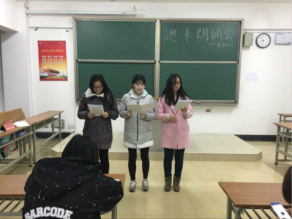 教科1511一直致力于打造周恩来班级,朝着这个方向,该团支部从未停止过行动的脚步。此次活动的第一个环节,便以一个新颖的方式向恩来先生致敬,“阳春时节/西花厅的海棠花/又要开了/我知道/他只为一个人而开/我的忧伤在春天/大爱无边的海棠花/是冬天越堆越高的冷/是西花厅越积越厚的霜/是你越刻越深的纹……”朗朗的读书声忽然响起,班级里三位阅读功底较好的同学通过声情并茂的朗读立刻渲染出伤感的氛围,其他同学则马上被调动了情绪,专注地聆听着这首由李道立前辈为怀念周恩来总理的丰功伟绩而特别创作的诗歌。一花一世界,三月的忧伤,在此刻淋漓尽致地倾泻着……