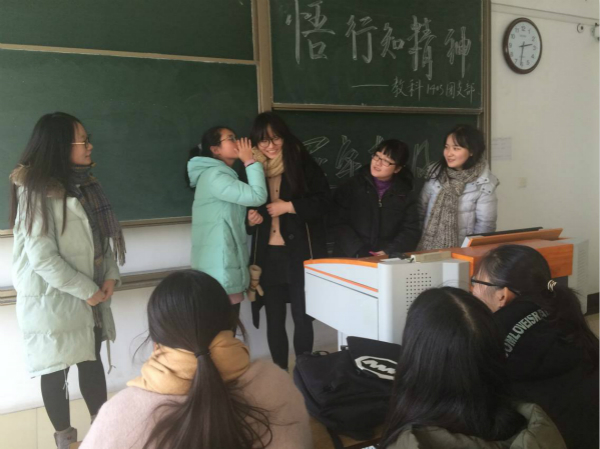 11月24日下午两点,教科1405 班围绕传承与弘扬陶行知先生的育人精神,开展“悟行知精神,展卓越风采”为主题的团日活动。活动由三个游戏进行,首先是“就不听指挥”的游戏,规则大致为分两队人,每队七个人,分两次进行,指挥者手戴一个卡通手套,先有其中一队排成一列依次上前,出题人用手迅速的指向一个方向,并且说“看这边”,然后挑战者必须看向另一个方向(左右上下),这个方向必须和出题人指的方向不一样。若相同则为失败,输的一方要集体为大家分享一个关于陶行知的小故事。同学们十分积极,踊跃参加,由于其中第一队的同学反应不够迅速,出了不少笑话,相比之下第二组反应则好的多。最终,第二队赢得胜利,那第一队的同学就分享了一个关于陶行知的有趣教育故事,大家听的都津津有味。接下来,趁着热烈的气氛,继续起第二个游戏“一只青蛙”,规则是全班同学参与,跟不上节奏或出错者罚节目。主持人说完规则后,就从第一个同学开始,开始时同学们还可以跟上,到了后面一句话时就有点乱了节奏,慌张中更添紧张气氛。最后,张同学卡住了。在全班的鼓掌声中,张同学表演了一首关于陶行知的诗朗诵,十分精彩。紧接着,“耳语传真之行知名言汇”游戏将气氛烘托到顶点,是分组PK,每组派一代表抽取写有陶行知的名言警句的纸条并交给主持人,主持人分别对列头兵耳语纸条上的话,这句话为不让其他人听见,要求照此往下传,有列尾者报出结果,看两列队伍哪个保真度更高,以次结胜负。接下来要将输的一组中出错的人找出来,且这位同学要将抽取到的名言警句面对面对着同组人员一一大声朗读。这次是以宿舍为单位出做游戏的人,被推选的同学都兴致很高,一个接着一个耳语,很神秘。大家以为这个游戏很简单,没想到两组最后的保真度都有损,最终按相似度,第一组险胜,游戏中的陶行知名言也深深的刻入同学的脑海中。游戏虽然简单,但传递的寓意却不简单!