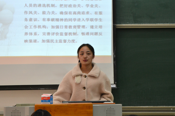 大会伊始,严格详细地介绍了全国学联二十七大的相关内容并阐述了习近平总书记贺信所体现的主要精神。她指出,在这个特殊的历史时期,作为祖国迈向新时代的建设者和共产主义事业的接班人,要坚定理想信念,锤炼高尚品德,积极进取,勤奋学习,勇于开拓创新,坚定跟党走的信念,争取日后为祖国的社会主义现代化建设贡献出自己的一份力量。最后,严格讲述了关于团委、员工会员工干部工作作风问题的若干规定,她强调员工干部要恪守员工本分,牢记服务宗旨,永葆理想情怀,摒弃庸俗习气,勤勉务实做事,营造和谐氛围。顾伊荻表示员工干部要在全面建成小康社会进程中贡献智慧力量、展现青春风采,做好党的青年工作。