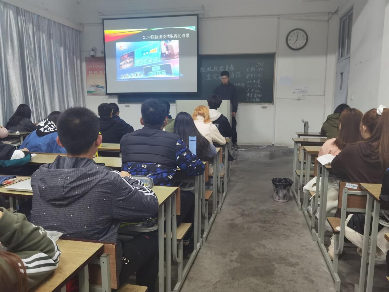 活动以一段视频拉开序幕,向同学们展现疫情对中国的影响。不论是视频中介绍的新冠疫情肆虐全球、世界局势波云诡谲,还是同学们自身感受到的交通、商业和生产销售链中受到的严重影响,都给同学们敲响了一声严肃的警钟。跟随着1906团支书讲解的节奏,同学们更加深刻认识到新冠疫情的严重性。