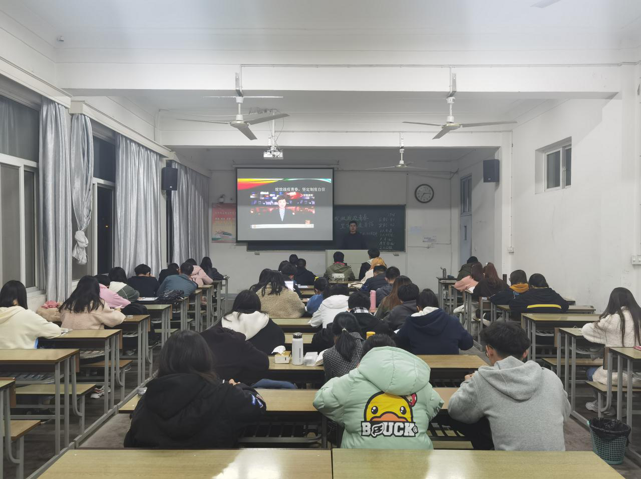 接着,持人用一个个真实事例向同学们展现了战疫一线的青年力量,他们用不懈的努力、汗水,证明了自己对祖国和人民的忠诚,证明了自己能够扛起中华民族伟大复兴的历史重任。他们不畏艰险、勇往直前的奉献精神激励在场所有的同学们见贤思齐,把对先进典型的敬仰和感动转化为勤学上进、干事创业、精忠报国的实际行动。