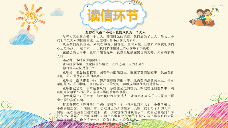 活动共分为三项,即制作海报,传达正能量;创作儿童节短视频,呼吁社会关注、关心、关爱贫困留守儿童;给儿童写信,鼓励他们勇敢地面对困难与挫折。