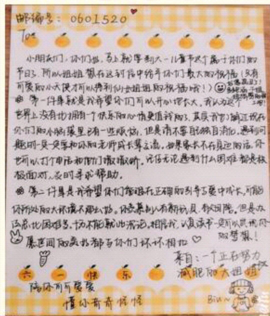 信件以鼓励和关爱儿童为出发点,引导他们树立正确的人生观和价值观,激励他们勇敢地面对困难与挫折。小小的一张纸承载了大大的支持,被资助工作部干事胡艳分享给江苏省淮安市盱眙县维桥中心小学一(1)班的小朋友,让他们感受到更多的鼓励。