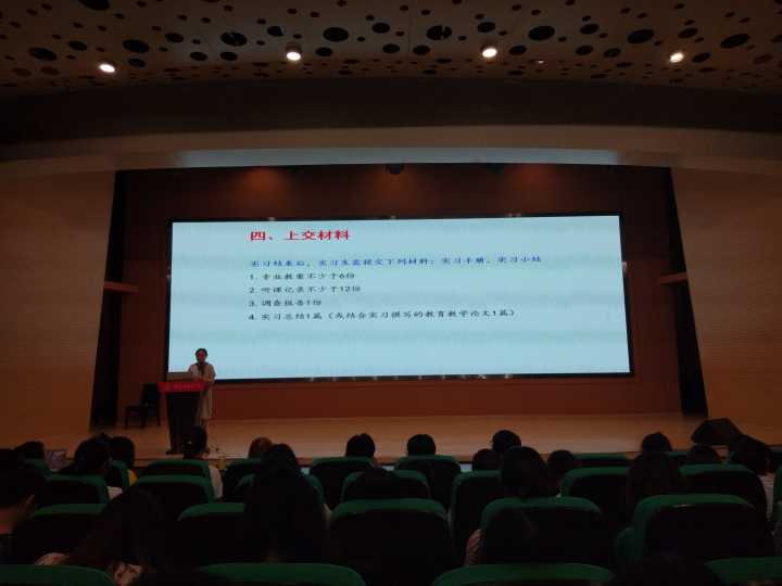 大会对实习时间安排、实习任务、纪律要求、上交材料、成绩评定等五个方面进行详细部署。实习从秋学期九月初开始,为期12周,三百余名小教学子根据自己的专业方向被安排往不同实习公司。为确保实习工作的深度落实,任红娟对实习提出五项任务:一、了解实习公司工作,观摩教学和班级管理等活动;二、认真对待教学工作;三、分清并学习班主任与少先队工作;四、关注教育调查;五、参与教育科研。对于教学工作,她尤为重视,提出认真备课、任教课时不少于15节、上交精品专业教案不少于6篇、听课记录不少于12篇、做好评教记录、谨慎批改作业和辅导等严格要求。严抓不懈的纪律问题在大会中仍被重点提及,任要求实习生服从实习单位规章制度、遵守课堂规则、小组成员互听互评密切合作、注意师仪师表、严格履行请假手续,尤其要注意安全。良好的学风与教科学子的风貌应该保持到实习单位中去,延续到未来的职业生涯中。会议最后,任对实习结束后所需上交材料进行详细解读。