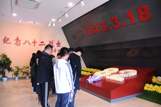 “日军改变战术,集中所有的山炮、九二步兵炮、迫击炮、掷弹筒,向4连阵地轰击,一时弹如雨下,烟尘滚滚。伤亡不断增加,但勇士们硬是凭着比钢铁还坚强的革命意志,死死地坚守在阵地上。”侗族员工1710班刘晓林在纪念馆第二展厅激动地回忆电影《刘老庄八十二壮士》中的情节并向周围的同学分享道:“在一片气壮山河的喊杀声中,勇士们端起刺刀,与敌人展开了白刃战。刺刀捅弯了,战士们就用枪托砸;枪托砸碎了,就用小锹砍;小锹砍断了,就用牙齿咬。一场悲壮的肉搏战终因力量悬殊,四连八十二名勇士全部倒在这片湿润的土地上。纪念馆里的东西真是高度还原了历史,当我看到衣物、枪支、电话、等物时,我脑海中的电影也在放映着,让我感慨万千,这部红色经典让我落泪了,它丝毫不逊于我看过的好莱坞大片,尤其是听到冲锋号时,与其说被艺术感动,我更愿意相信那是真实。烈士不应该无名,烈士应该永远被记住。”电影分享结束后,陈萌组织员工们在纪念馆前进行默哀仪式。他们纷纷表示回去之后一定会重温经典,铭记历史。