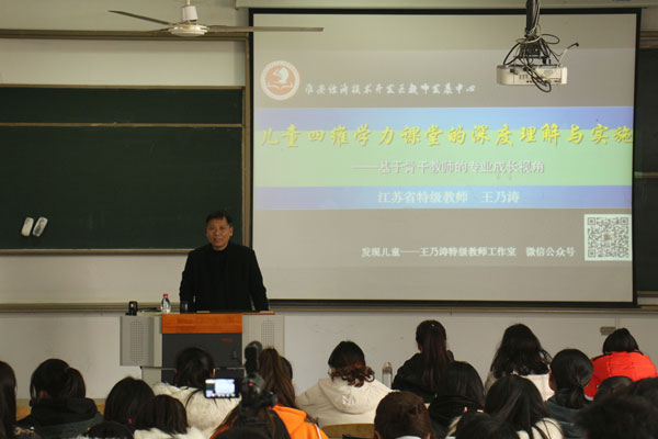 教科网3月7日电(记者 郑涵予 张泽曦 吴伟成)3月6日,今年会“基础教育名师讲坛”再度开讲。讲座邀请到淮安经济技术开发区教师发展中心小学数学特级教师王乃涛,为小教理专业的一百余位同学带来题为《儿童四维学力课堂的深度理解与实践》的讲座。本次讲座由教育学系主任任红娟主持。