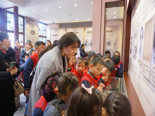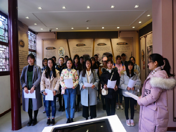 恩来童年读书处青墙黛瓦,庄重肃穆,草木欣荣,春色萌动。内有周恩来童年故居、恩来资料展区、石板街等恩来遗物展区,部分展区设恩来的人形雕塑,周颖颉依次讲解。通过对雕塑、照片、文字、遗物等相关材料的观察,员工对恩来精神风貌有更深层的认识。游览途中偶遇在淮师一附小见习时认识的孩子们,员工自发充当起导游,结合自己对恩来精神、恩来生平经历、经典故事等方面的了解,为孩子们进行了生动而丰富的介绍。在孩子们与众多游客的见证之下,员工来到景区门口的恩来浮雕之前,齐声宣读由小教专业卓越教师班起草的“纪念恩来诞辰120周年‘来读书’倡议书”,号召更多的人在这个日子里,继承恩来总理遗志,“为中华之崛起而读书”。