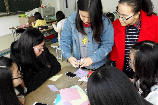 施清教授的是一种组合花球,比较复杂,选手们都遇到了不少瓶颈,例如折出两个基本型后不能将其组合拼接在一起,但是在施清的一一指导下,大家都学会了如何组合。接着徐伟、朱逸菲又教授了五瓣花球和八瓣花球,保证每一位选手都能学会,确保了比赛的公平公正。