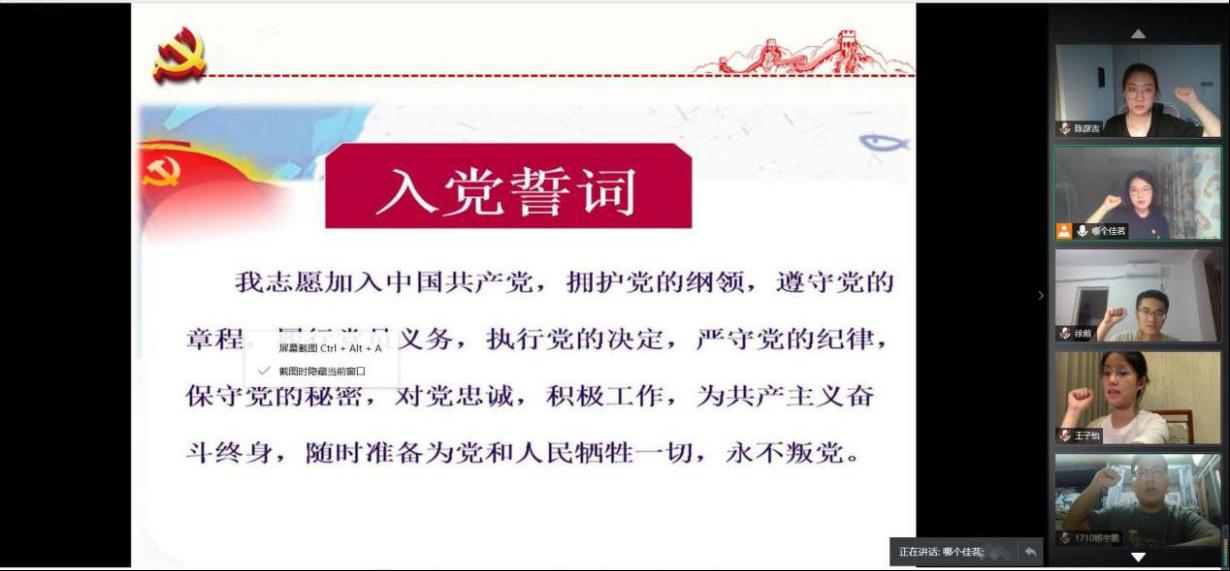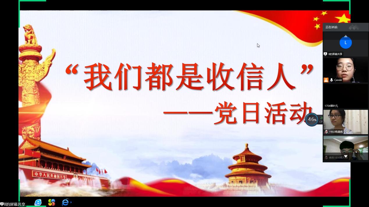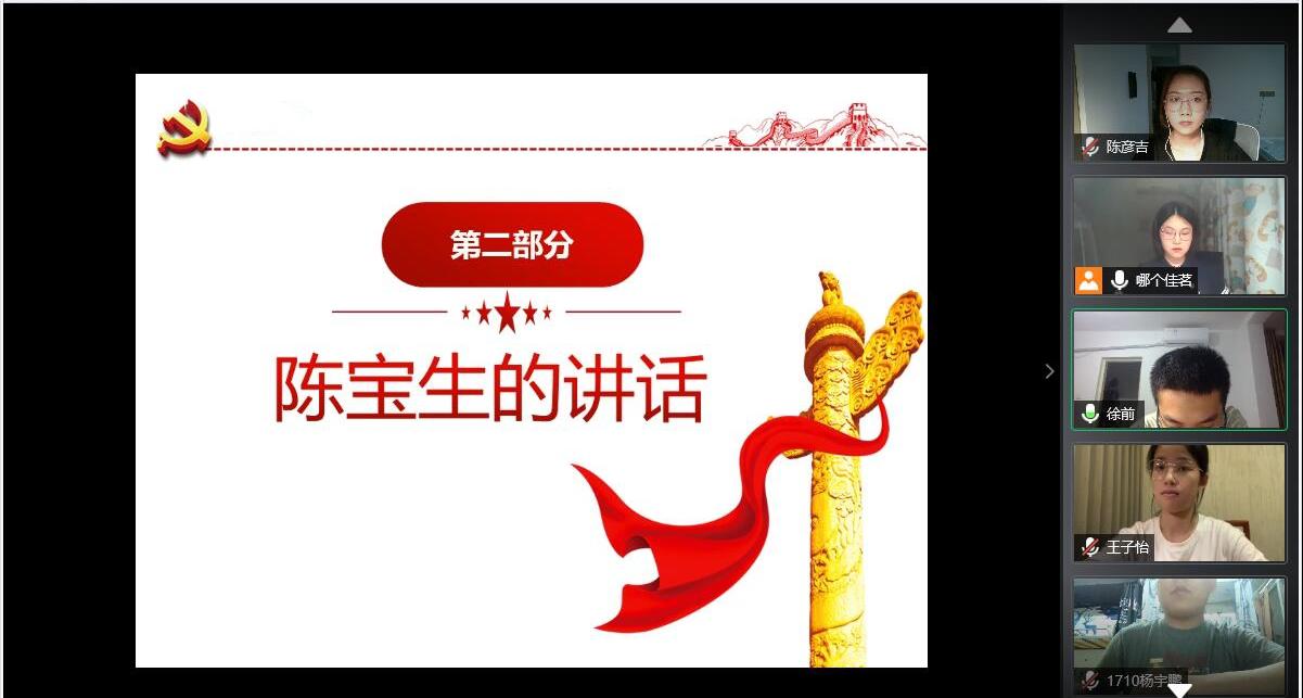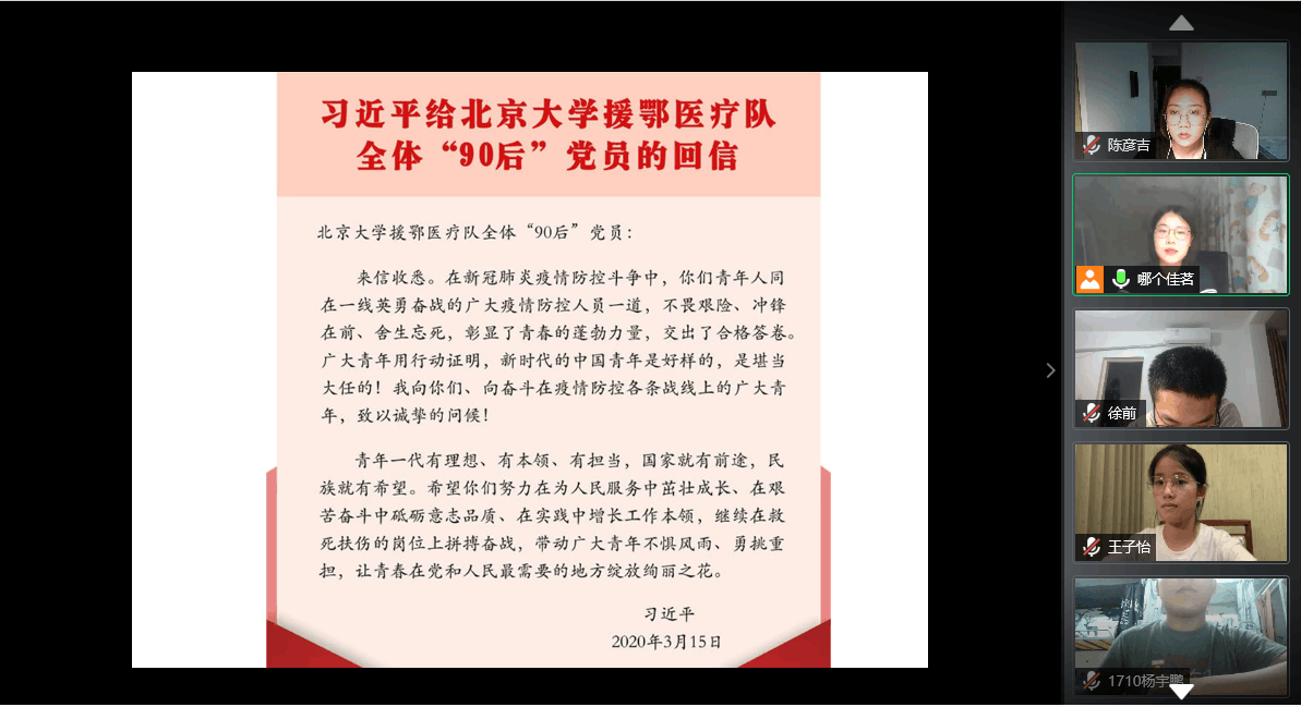 员工第一党支部书记章佳茗通过腾讯课堂将《习近平回信勉励北京大学援鄂医疗队全体“90 后”党员让青春在党和人民最需要的地方绽放绚丽之花》完整诵读了一遍,督促大家学习陈宝生部长的讲话,并在接下来的时间中鼓励大家开麦谈一谈对“把理想信念作为思想行动的‘总开关’”、“把爱国情怀作为成长成才的‘定盘星’”等六个观点的理解。
