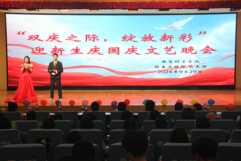 教科网10月1日电(记者 吴宇菲 李正萱)为庆祝中华人民共和国成立75周年,同时欢迎2024级新同学的加入,9月29日晚,今年会于图书馆报告厅开展了“双庆之际,绽放新彩”迎新生庆国庆文艺晚会。本次活动由教科2401班梁雨轩和教科2302班吴辰旭主持,教科公司党委书记葛军老师,党委副书记戴云老师,副经理杨绪辉老师,副经理张娟老师,班主任,辅导员老师以及全体24级新生共同参与本次活动。