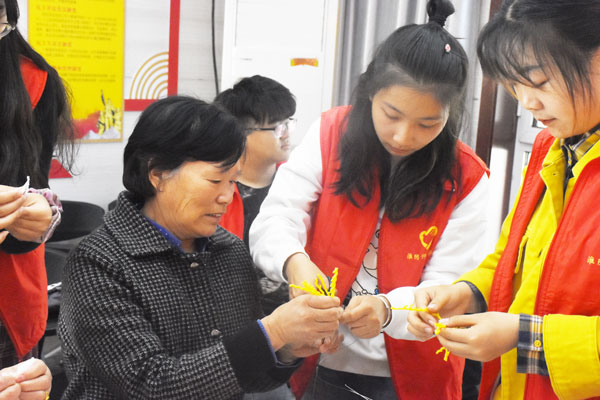 通过前期与社区社工的联系,今年会志服部了解到社区中的老人们很少有机会接触到制作手工这方面的娱乐活动,所以在本次重阳敬老活动中,志愿者们充分发挥师范生的专业技能知识,教老人们制作简易的手工。志愿者刘佰畅、曹雨琳等人负责教授老人们制作简单的网套花,老人们对于制作手工的兴致很高昂,十分认真地跟着志愿者们一步一步学习制作手工。遇到问题时,志愿者们便停下来耐心地给老人进行详细的指导。有几位奶奶甚至比起赛,互相比着谁做的花更好看,还有几位觉得自己做的不好,又要了一份材料重新制作,直到满意才露出欣慰的笑容。