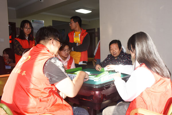 星光社区基础设施完善,可供老人娱乐的场所丰富多样。其中,麻将与扑克牌是老人们休闲娱乐的首选。为帮助老人们解闷,在本次活动中,会打牌的志愿者融入老人群体之中,与老人们开展了一场又一场精彩绝伦的“牌桌大战”。牌桌上,将牌之间触碰的清脆响声与老少之间相谈的话语声相融合,当老人赢牌时,他们脸上露出自豪的表情,惹得众人纷纷发笑。午后的阳光正好铺洒在每个人的身上,构成了一幅岁月静好的画卷。