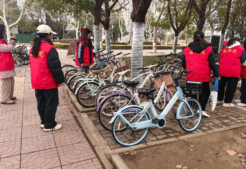 与此同时,在校园自行车停放区域,整理自行车的活动也在有条不紊地进行。面对摆放杂乱的自行车,志愿者们齐心协力,将车辆一辆辆扶起并按照车头一致的方向整齐排列,使原本混乱的停车区域变得井然有序。他们的努力不仅方便了师生的日常出行,也展现出良好的校园秩序与文明风尚。