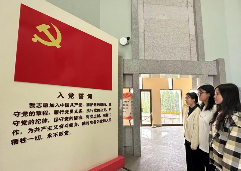 党员同学在党旗下庄严宣誓,铿锵誓言回荡在纪念馆庭院,彰显新时代青年的理想信念。