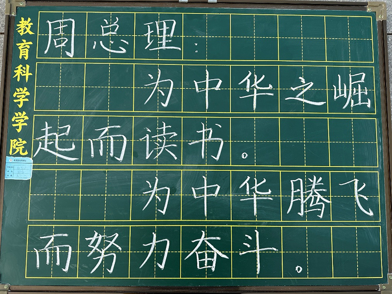 活动中,同学们围绕周恩来名言展开讨论,探讨青年一代的责任与担当。同学们在庭院小黑板前挥笔书写“为中华之崛起而读书”,粉笔飞扬间,字迹或清秀或刚劲。班主任张菁菁老师表示:“板书是师范生的基本功,而你们将总理精神写进了每一笔画。”