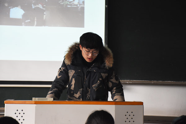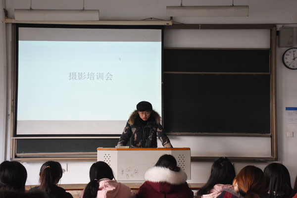 干爽结合以往新闻实例,指出了干事们本学期拍照时存在的一些问题:水平线不齐;明暗的把握不到位等。接着,他向大家展示了一些优秀照片,并且提出了一些改进方法。他给出具体拍摄指导:在教室拍摄时,一定要把PPT、主讲人,观众包括在内;在大会议室拍摄时,一定要注意人物特写。他强调,任何照片都要注意把握明暗程度。随后,干爽向干事们介绍了一些相机的基本要素,如相机参数,ISO,快门速度,光圈大小。当环境偏暗的时候,ISO需要调高,快门速度要调慢;光线强烈,就要缩小光圈。同时,他指出,光圈是决定景深大小最重要的因素。他介绍了一些PS的技巧,强调图片一定要用jpg格式保存。